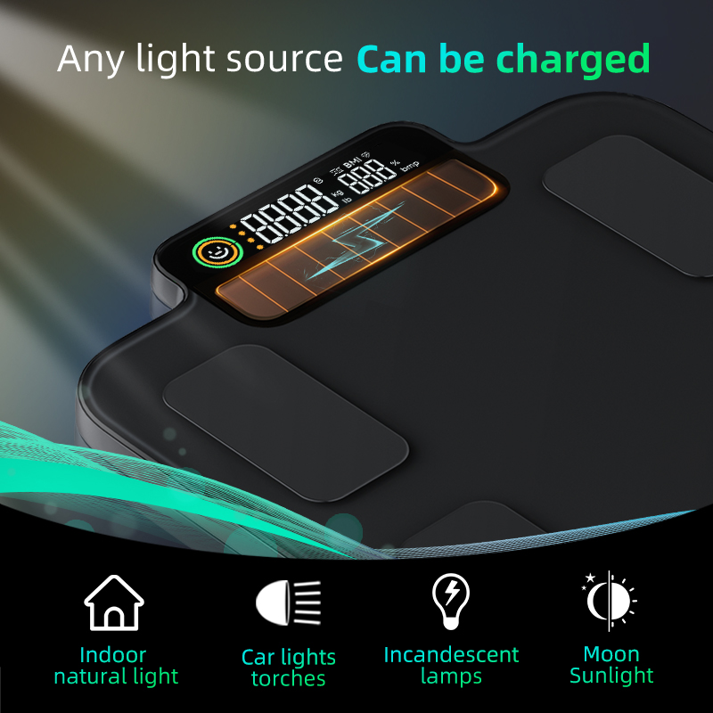 1)Solar charging, long-lasting battery life: The photovoltaic body fat scale does not require frequent battery replacements or the use of charging cables. For example, the Lefu Solar Body Fat Scale, even in a dark environment without light, can weigh once a day for 15 seconds. The built-in high-capacity storage battery can last for 4 years, and weighing once every two days can support a battery life of 8 years.